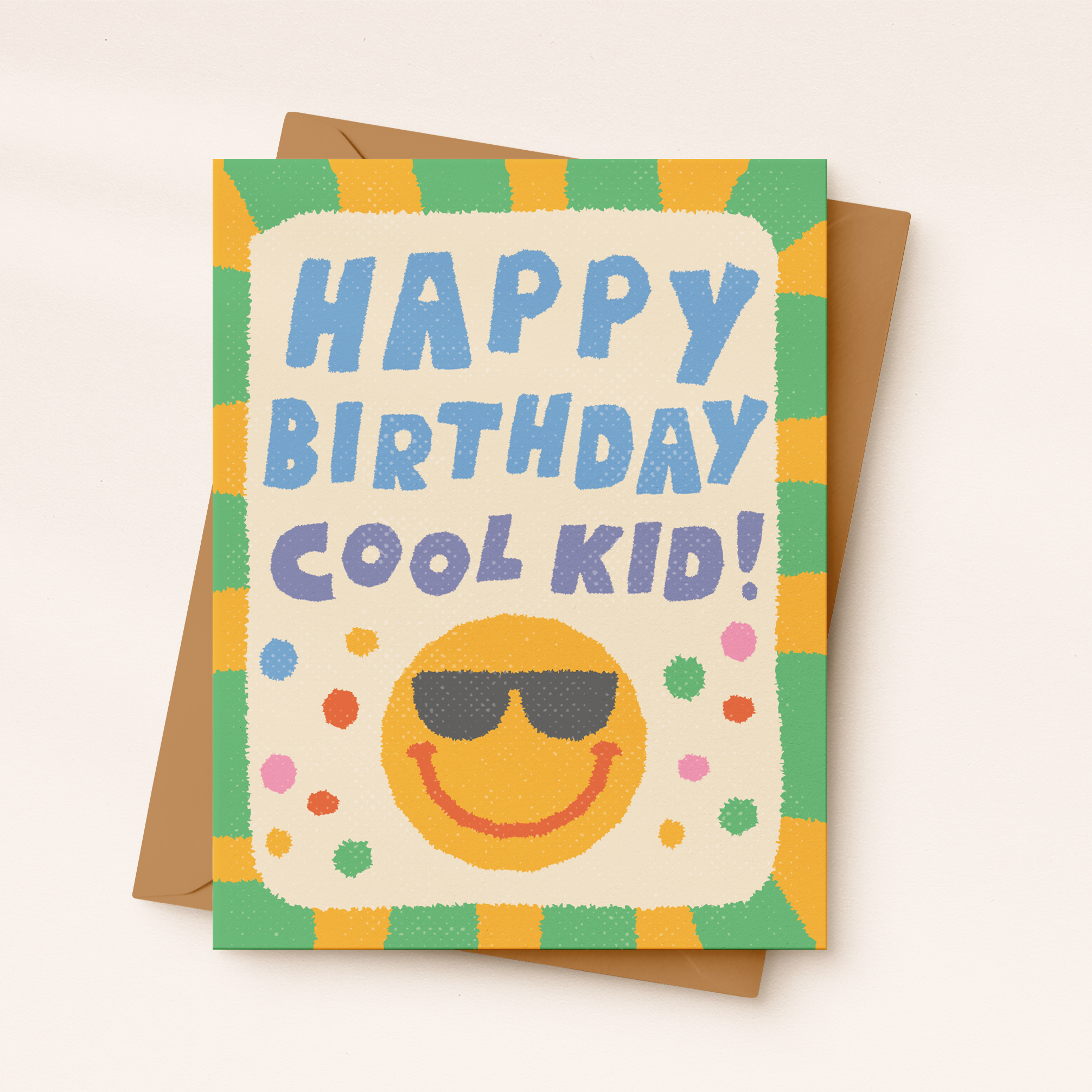 This cheerful kids birthday card brings big sunshine energy with its retro block lettering, playful bright colors, and a cool smiley face in sunglasses. Perfect for celebrating the fun, confident, one-of-a-kind kid in your life. Great for ages 3 to tween, and a best-seller style for boutiques, toy stores, bookstores, and kid-friendly gift shops. A feel-good birthday card that spreads pure joy. ✔ A2 size (4.25 in x 5.5 in) ✔ Blank inside ✔ Digital print on premium textured stock ✔ Paired with a 100 percent recycled kraft envelope ✔ Packaged in a plastic-free, biodegradable clear sleeve ✔ Made in Portland Oregon USA ✨ Perfect for kids birthdays, milestone ages, party favors, and any little legend who deserves a smile.