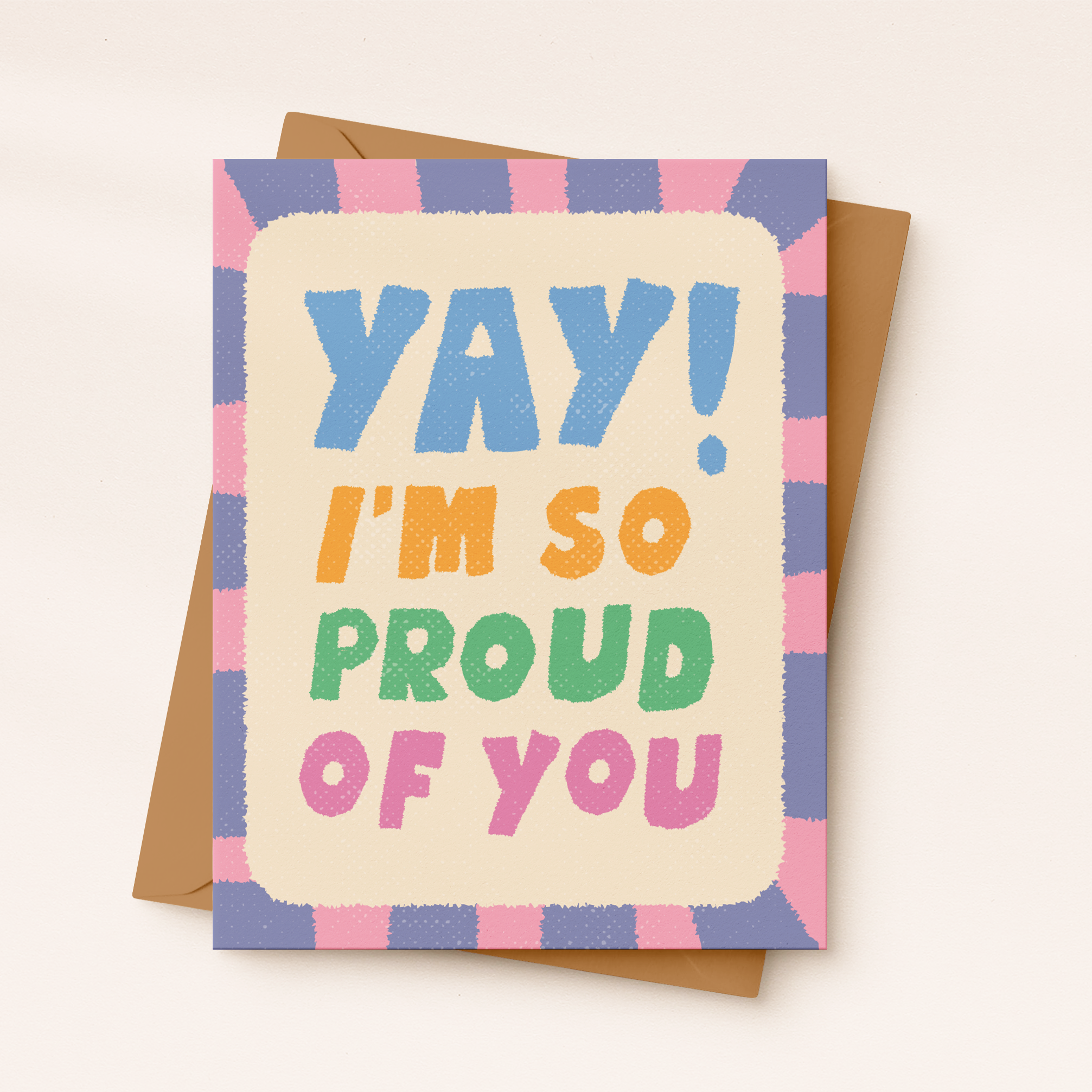 Celebrate every achievement, big or small, with this cheerful Yay! I’m So Proud of You greeting card. Featuring bold rainbow lettering framed by playful pink-and-purple stripes, this card brings instant positivity and encouragement. Perfect for graduations, big milestones, report card wins, new jobs, sports accomplishments, and everyday moments worthy of a happy dance. A bright, kid-friendly, confidence-boosting card that makes anyone feel seen and celebrated. ✔ A2 size (4.25 in x 5.5 in) ✔ Blank inside ✔ Digital print on premium textured stock ✔ Paired with 100% recycled kraft envelope ✔ Packaged in a plastic-free, biodegradable clear sleeve ✔ Made in Portland Oregon USA ✨ A joyful card for graduates, kids, students, friends, coworkers, or anyone who deserves a proud-of-you moment.