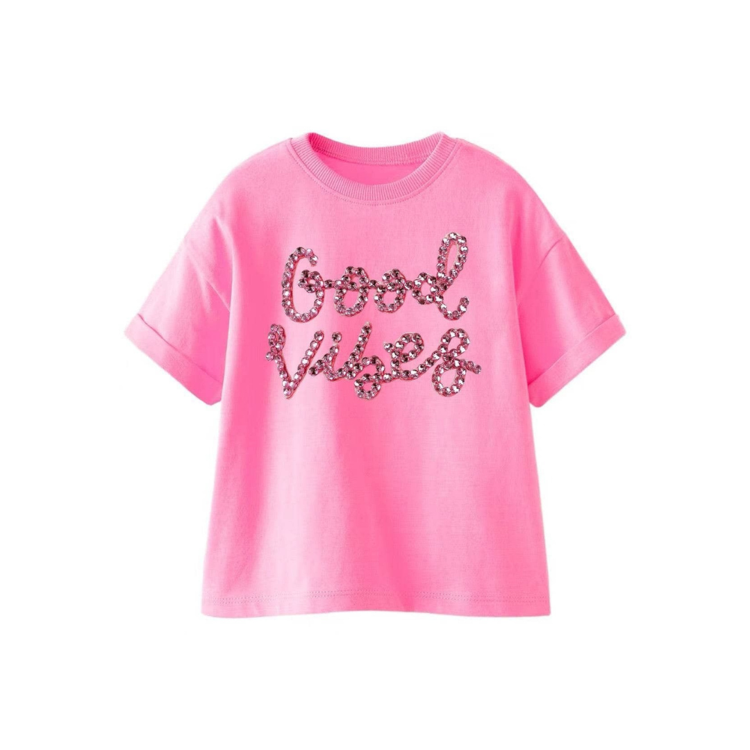 Pink Crystal Good Vibes Tee - 4 is backordered and will ship as soon as it is back in stock.