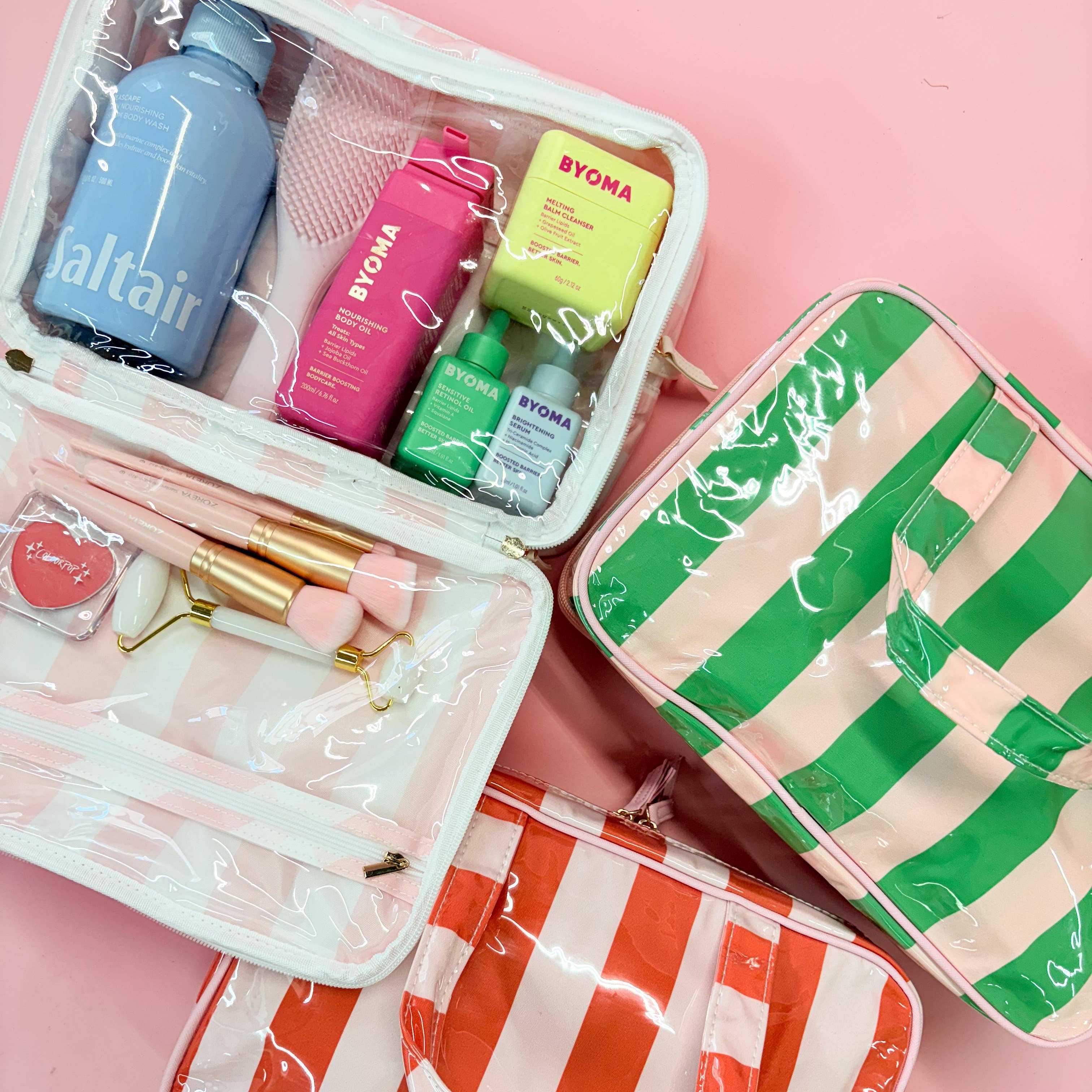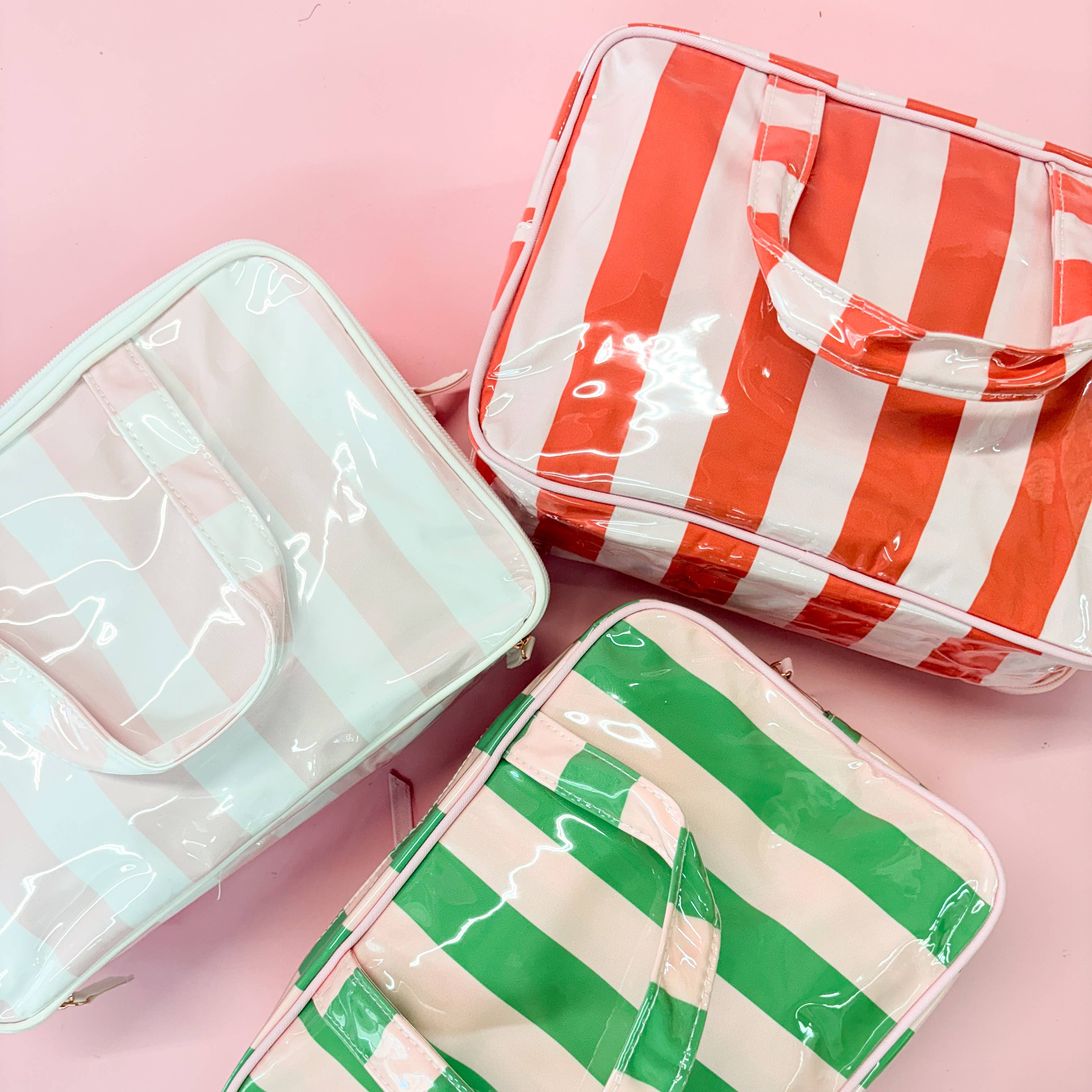 Brighten up your routine with our colorful stripe wipeable cosmetic toiletry bags! These cheerful, candy-striped bags are the perfect travel companion or vanity essential. Available in three vibrant hues. Key Features: Eye-catching stripes: Fun, bold color combos with a glossy, wipeable finish. Spacious interior: Easily fits all your beauty must-haves. Smart organization: Includes inner elastic pockets for bottles and a clear zip compartment for small essentials. Easy to clean: Waterproof lining keeps spills and messes under control. Sturdy handle: Carry it effortlessly on-the-go. Whether you're jet-setting or staying home, these bags make packing pretty — and practical! Great for toiletries, makeup, travel essentials, baby items, etc.