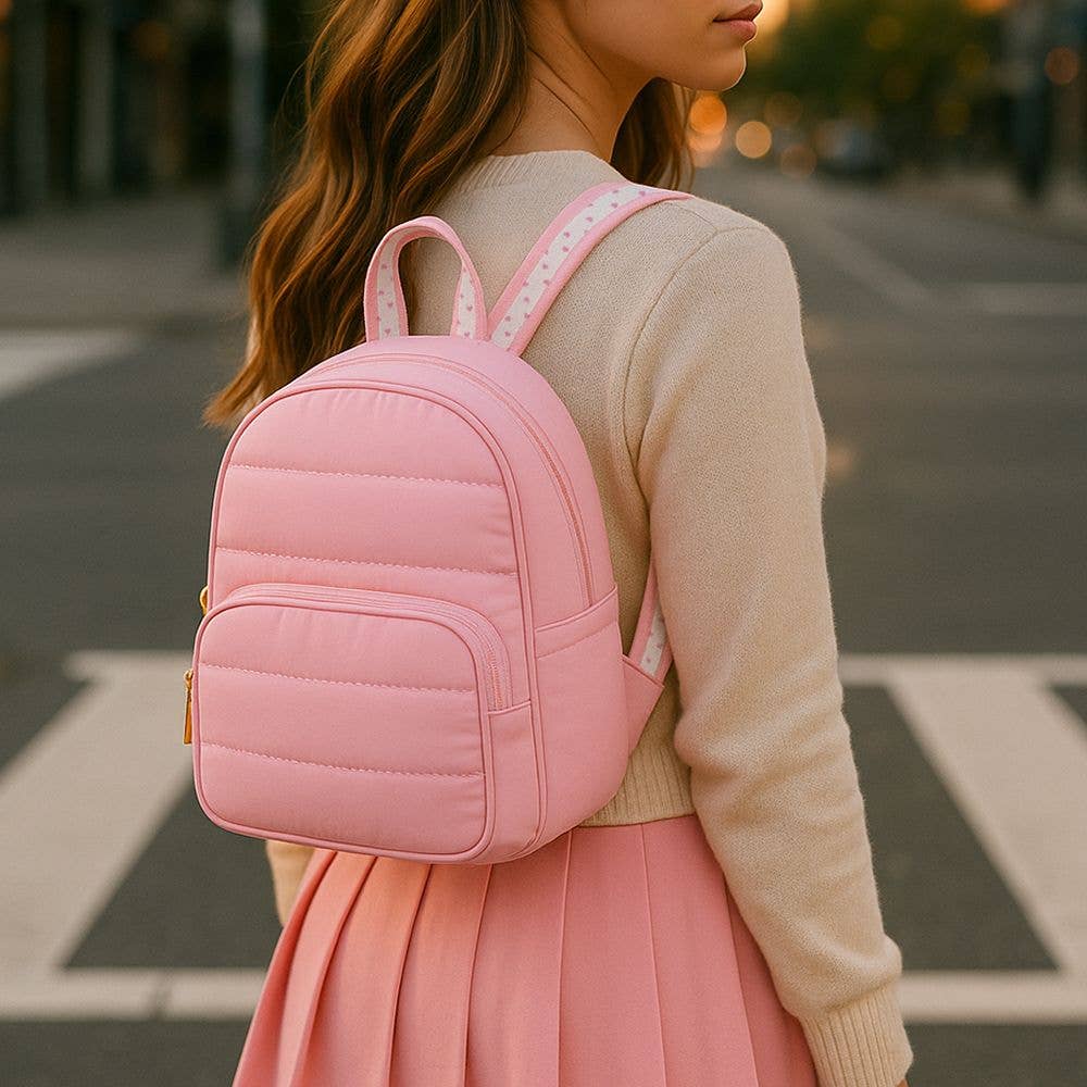 Pink Puffer Mini backpack with Heart stripes with adjustable straps. Great for on the go and all ages, size is 12 x 12 .